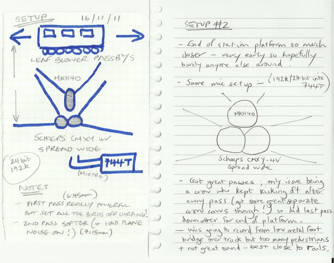 As soon as I realized they obviously adhered to a set timetable (well, as much as any train does in the UK…) I decided to get out and record a few for The Sound Collectors’ Club’s Trains: Design Collection. I managed to get a couple this morning without much difficulty, apart from the birds being disturbed by the first pass and chirping all over the tail of the train pass. RX2 should fix that though. I recorded the passes LCR into a Sound Devices 744T, with a Schoeps CMXY 4V spread wide to virtually 180 degrees and my Sennheiser MKH40 in the middle.