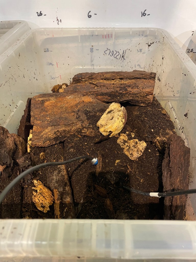 What we did not know and were about to uncover – quite literally – were the sounds produced by beetle larvae, inside decaying soil matter. We buried the hydrophones in one of the breeding boxes that was full with soil and rotting wood, essentially converting them into contact mics. This is what we got: